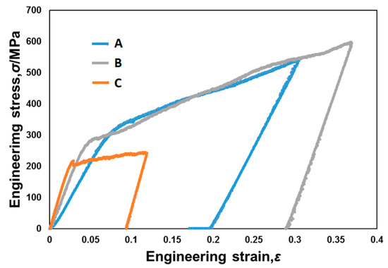 Engineering stress–engineering strain curves of microcompression tests for Cu-Ni-Si alloy specimens A, B and C.