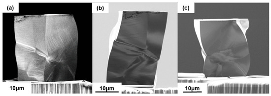 The microsized specimens were fabricated by a FIB (FB2100, Hitachi, Tokyo, Japan) from the bulk sample described in former Section 2.1 [16,17]. In the beginning, the sliced sample with the thickness of about 50 m was fabricated from middle part of the bulk sample. For fabrication of the pillar, the specimen was tilted at −45 ± 2 degrees to avoid tapering of the pillar. For the compression test, three micropillars (specimens A, B and C) with different grain geometry as shown in Figure 1, having the identical size of 20 × 20 μm2 in cross section and 40 μm in length were fabricated.