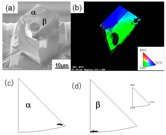 Crystal characteristic of the Cu-Ni-Si alloy specimen A after the compression test observed by (a) SIM and (b) electron backscattering diffraction (EBSD) image (ND) with inverse pole figures (Z axis) of grains α and β shown in (c,d) respectively.
