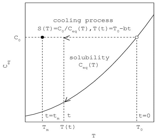 where, as shown in Figure 1, is the initial saturated temperature at , is the maximum supercooling temperature at , is the MSZW, is the saturated concentration at , is the temperature-dependent supersaturation during the cooling process, and is the temperature-dependent solubility. Note that remains unchanged before the onset of nucleation. As usually decreases with decreasing temperature, increases with decreasing temperature; and subsequently defined in Equation (1) increases during the cooling process.
