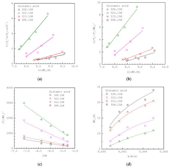 The experimental MSZW data of aqueous glutamic acid solutions at various (a) fitted to Equation (12); (b) fitted to Equation (14); (c) fitted to Equation (19); (d) fitted to Equation (4). The MSZW data are taken from Shiau and Lu [32].