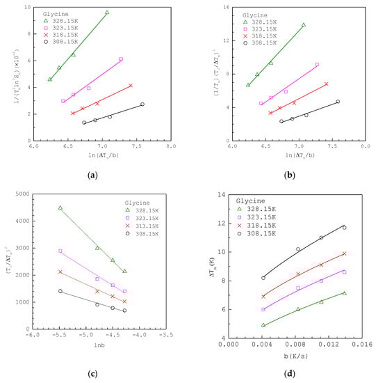 The experimental MSZW data of aqueous glycine solutions at various (a) fitted to Equation (12); (b) fitted to Equation (14); (c) fitted to Equation (19); (d) fitted to Equation (4). The MSZW data are taken from Shiau [38].