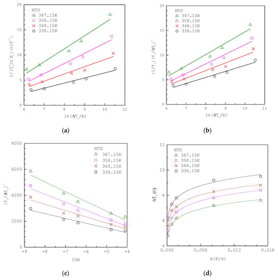 The experimental MSZW data of aqueous NTO solutions at various (a) fitted to Equation (12); (b) fitted to Equation (14); (c) fitted to Equation (19); (d) fitted to Equation (4). The MSZW data are taken from Kim et al. [40].
