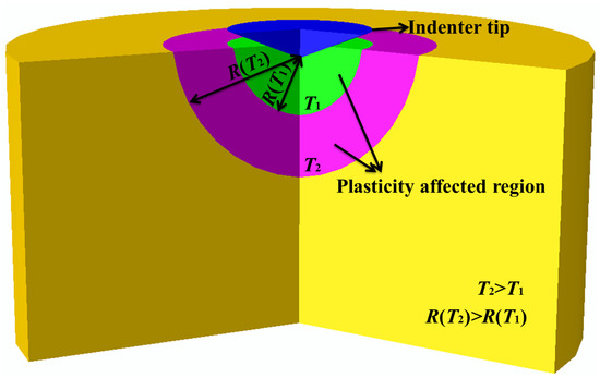 where and . Here, is the angle between the surface of the indenter and sample, and denotes the radius of the plasticity affected region that proportionally scales with the indentation depth h with a proportional coefficient , that is, . At elevated temperatures, both lattice friction and dislocation impediment strength get weakened, which dramatically facilitate the expansion of the plastic region, and lead to the increase of and with T [24], as presented in Figure 1. Moreover, is expressed as