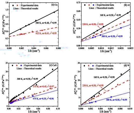 With these calibrated parameters, the relationships are compared between the theoretical results (lines) and experimental data (dots), and a reasonable agreement is achieved, as presented in Figure 2. It shows that both the intercept and slope of the fitting line decrease with increasing temperature, which mutually contribute to the decrease of and at elevated temperatures. The former is mainly ascribed to the weakened elastic constants and dislocation strength coefficient with the increase of temperature, and the latter originates from the stimulated expansion of the plasticity affected region at high temperatures that results in the decrease of the intrinsical length scale and limited indentation size effect. Moreover, the hardening coefficient m of Cu and CaF2 is noticed to decrease with increasing temperature when compared with that of Al and W. Similar experimental data has also been observed for OFHC copper that m decreases from 0.48 to 0.41 when T increases from 293 K to 698 K [36], which indicates the weakened work hardening behavior at elevated temperatures that resembles an elastic-ideally plastic material [24]. In order to further characterize the thermally activated deformation mechanisms resulting in the decrease of m with T, it could be addressed by the nano-indentation strain jump tests [10] or long term creep tests [37], especially in terms of the strain-rate sensitivity.