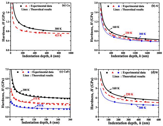 In Figure 3, we present the H − h relationships obtained from the calibrated theoretical model and experimental data of single crystal Cu [24], Al [16], CaF2 [25] and W [16]. As one can see the results match reasonably well for the four materials, and an obvious indentation size effect is informed at different temperatures. However, the increasing rate of H with the decrease of h tends to decrease with the increase of temperature, which is determined by the decrease of at elevated temperatures, as illustrated in Figure 2. In addition, the bulk hardness at the deep indentation depth also decreases with increasing temperature as both the hardness components and get weakened at high temperatures.