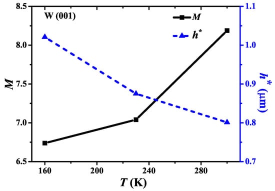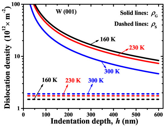 Last but not the least, the evolution of and as a function of h at different temperatures is compared for single crystal W, as illustrated in Figure 5. According to Equation (3), is determined by both and h. Thereinto, the inverse scaling law between and h indicates the fundamental mechanism for the indentation size effect. Whereas, this scaling law tends to get weakened at high temperatures due to the increase of with T. As a comparison, is independent with h but only increases with T. Moreover, one should note that is generally more than one order of magnitude higher than at the shallow indentation region, indicating the dominant dislocation hardening mechanism originates from the contribution of GNDs.