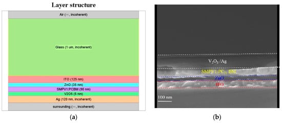 The electrical characteristics of the solar cells were measured in a glovebox at room temperature. To measure the efficiency of the solar cells, the devices were illuminated at 100 mW/cm2 from a 150 W Oriel solar simulator, using an air mass 1.5 global (AM 1.5G) filter to obtain the current density–voltage (J–V) curve. To make sure that the active layer matched with our optimized simulation result, SEM cross-sectional images were also taken, as provided in Figure 1b.