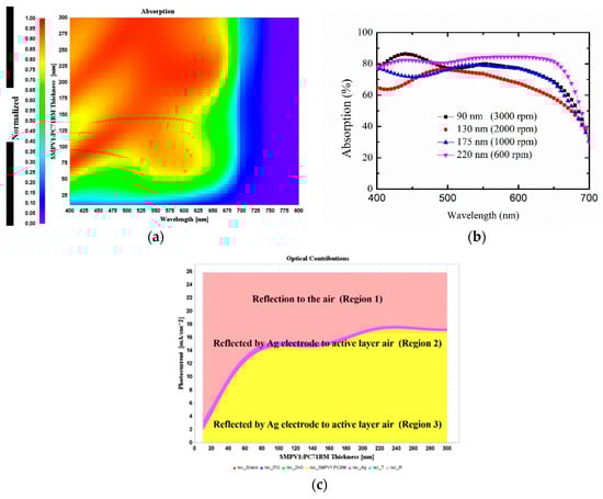 (a) Simulated absorption spectra of the devices with the various thicknesses of active layer. (b) The absorption spectra of the devices with various active layer thicknesses. (c) Optical contribution by each layer.