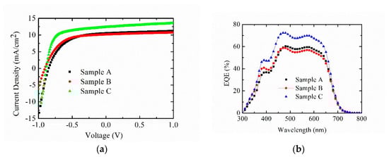 Figure 4a shows the J–V curves of samples A, B, and C. The thickness of the device (sample C) is determined by the SEM cross-sectional image, as shown in Figure 1b. The series resistance (Rs) and sheet resistance (Rsh) are calculated by the inverse of the curve gradients at V = 1 and V = 0 respectively []. From the results, Sample C can be observed to possess lower Rs compared to both samples A and B, implying that the SVA treatment is able to simultaneously prevent the leakage current and reduce the series resistance. The EQE of samples A, B, and C were also measured, and are shown in Figure 3b. According to the EQE spectra, the Jsc of the device can be calculated to be 9.91, 9.68, and 11.87 mA/cm2 respectively for samples A, B, and C []. The slight difference between the Jsc from the EQE and PCE results may be caused by the different measurement light source used, but both results exhibited similar trends nonetheless []