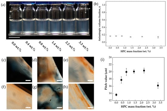 From an LC colloidal aqueous suspension with a concentration of CNCs of 3.3 wt.%, different mixtures of CNC/HPC with ratios of 10, 20, 30, 40 and 50 were prepared. In the range of concentrations of HPC used in this study we did not observe the gelation as detected by Hu et al. when adding small amounts of other polysaccharides (e.g., hydroxyethyl cellulose or hydroxypropyl guar) to a diluted suspension of CNCs [30]. The CNCs/HPC mixtures were allowed to settle until phase separation was observed, as shown in the photograph obtained between crossed-polars presented in Figure 1a. From this image, it is possible to note that, macroscopically, the introduction of the macromolecule of HPC in the LC-CNCs suspension seems not to influence the liquid crystalline phase, if one compares the birefringence obtained in the CNCs/HPC/H2O mixtures and the CNCs/H2O suspension. Indeed, this observation is confirmed by the determination of the volume of anisotropic fraction, since all mixtures present a similar value of ϕ of ~0.15, observed in Figure 1b. A similar result was macroscopically observed by He et al. for the composite colloidal suspensions of CNCs/glycerol [15]. Still, the authors could observe an almost linear dependence in the pitch value of the suspension as the content of the polyol glycerol increases (from 0.85 μm for 0 wt.% glycerol to 1.15 μm 40 wt.% glycerol). The preparation of sealed rectangular vials allows us to observe the suspensions with polarised microscopy. In Figure 1c–h, the fingerprint texture observed in the anisotropic phase of the colloidal mixtures of CNCs/HPC/H2O can be observed. If the pitch value is plotted as a function of the concentration of HPC in the colloidal suspension, depicted in Figure 1i, one can also see a direct dependence of the pitch value with the HPC content up to 0.8 wt.%, the subsequent further increase of HPC in the system does not seem to affect the pitch value of the suspension. Moreover, when 3.3 wt.% of HPC is introduced in the colloidal suspension, a reduction of 4 μm in the pitch value is observed (comparing with the system with 2.2 wt.% of HPC); however, this value is still a higher value than the one observed for the neat CNCs colloidal suspension.