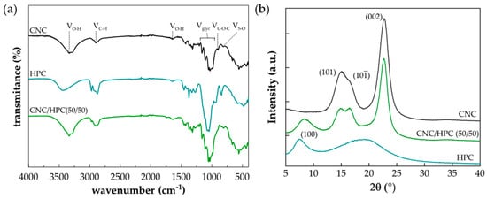 (a) FTIR spectra of CNCs, HPC and CNC/HPC (50/50) films; (b) XRD patterns of neat CNCs, HPC and CNC/HPC (50/50) composite films.