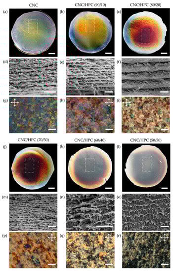 (a–c,j–l) Photographs of neat CNCs and CNC/HPC films with different content of HPC taken under uncollimated unpolarised white light; (d–f,m–o) SEM images of the central region of the cross-section of the CNCs and CNC/HPC films, where the chiral nematic arrangement can be observed; (g–i,p–r) POM images obtained with crossed-polars and in transmission mode of the central regions of neat CNCs and CNCs/HPC films. Scale bars: (a–c and j–l) 5 mm, (d–f) 500 nm, (m–o) 1 µm, (g–i and p–r) 100 µm. POM images. In the photographs, a dashed white rectangle was added that marks the area observed with the UV/VIS/IR spectroscopy.