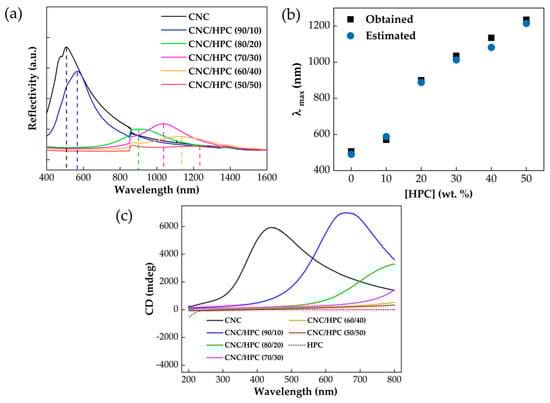 (a) Reflectance spectra captured from the marked region of CNCs and CNC/HPC composite films across the visible and near-infrared regions of the electromagnetic spectrum of light, where it can be seen that the increase in HPC content leads to an increase of the maximum wavelength reflected to the near-infrared region; (b) maximum reflected wavelength plotted as a function of HPC concentration in the composite system, black squares represent the obtained values from reflectance spectra, whilst blue dots represent the estimated values using Equation (1), where the average pitch value was measured from SEM images, like the ones presented in Figure 3; (c) corresponding circular dichroism spectra of CNCs, CNC/HPC, and of a neat HPC film.