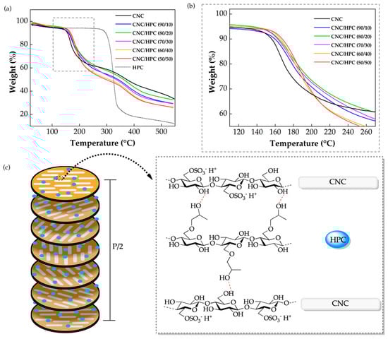 (a) Thermogravimetric analysis curves of neat CNCs, HPC and CNCs/HPC composites; (b) inset of the thermogravimetric curves in the range of temperatures of 110–260 °C; (c) proposed chiral nematic arrangement (right) where the CNCs rods (white anisotropic particles) are surrounded by HPC macromolecules (blue dots), the left scheme shows some possible hydrogen bonding (red dashed lines) between the OH groups of CNCs and HPC. Note that the representation of the number of substituents on the CNC or HPC schematics is not factual.