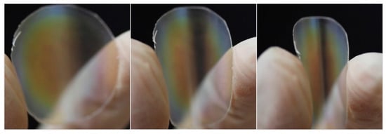 From the values of strain, determined by Equation (2), it is possible to note that as the HPC content increases in the composite system the films became less brittle since the maximum strain value increases (Table 1). Up to a concentration of HPC of 20 wt.%, no significant change in the composite behaviour while being bent is observed, when compared with the neat CNCs films. If 30 wt.% of HPC is used the strain value increases from 0.7%, from neat CNCs films, to 4.0% in the composite, showing an increase in flexibility as can be seen in Figure 6, where a sequence of pictures shows a composite film being bent. On the composite system with 40 wt.% of HPC only one sample breaks when submitted to the bend-test, whereas an HPC content of 50 wt.% leads to tests where the samples did not crack.