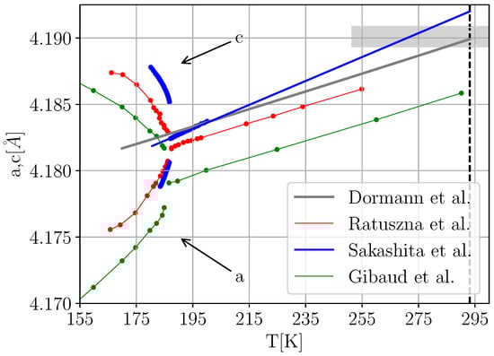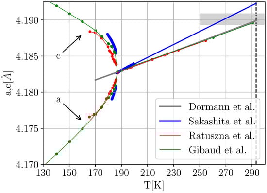 Figure 1 illustrates, while a discontinuous behavior of the lattice parameters is clearly visible in all three data sets, the absolute values of the measured unit cell parameters differ considerably, yet none of the data sets seem to be compatible with extrapolating the thermal expansion data of Ref. [