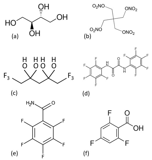 Chemical structures of (a) erythritol, (b) PETN, (c) HFPT, (d) N-BPFPO, (e) PFBA, and (f) 246 TFBA.