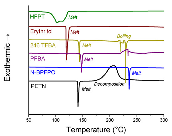 Typical differential scanning calorimetry (DSC) thermal profiles for PETN and mock candidates. Profiles are arbitrarily offset along the y-axis for clarity.