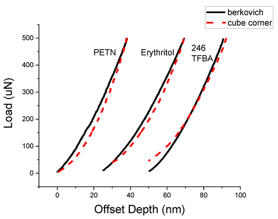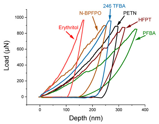 Unloading traces indicating indentation-induced fracture at 500 μN for PETN, erythritol, and 246 TFBA.