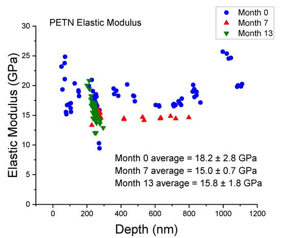 Nanoindentation results for PETN were previously published by Zhai and McKenna [18], showing a dramatic depth dependence for elastic modulus. Their results showed that PETN appeared to be stiffer (i.e., higher modulus) at the surface, with a significantly decreasing stiffness as a function of depth (indenter penetration) into the material. This type of result is atypical for similar molecular crystals, both energetic and inert, that have previously been characterized via nanoindentation. To assess the elastic modulus of PETN crystals used in this study, indentations were made and modulus measured over a similar range of depths, as shown in Figure 5. No such depth dependence was seen, with the experiment repeated over a period of seven months to ensure thoroughness. While no depth dependence was revealed, the elastic modulus of these PETN crystals did appear to decrease from month 0 to month 7, prompting additional assessment of the elastic modulus again at month 13 to observe if any changes were occurring due to the age of the material. While the elastic modulus of the newly synthesized material measured 18.2 ± 2.8 GPa, the material at ages 7 months and 13 months appears to have settled around 15.0–15.8 GPa. Due to the behavior of the samples at larger depths at month 0 and the low indentation depths of typical nanoindentation tests, differences over time were also considered only for indents below 300 nm in depth. Considering only those indents below a depth of 300 nm had a minimal effect on the results, with the elastic modulus at month 0 measuring 18.4 ± 2.9 GPa, at month 7 measuring 15.1 ± 0.6 GPa, and at month 13 measuring 15.8 ± 1.8 GPa, unchanged due to the lack of higher-depth indents at month 13. Other studies on PETN powder have shown similar trends with properties such as surface area coarsening, where newly synthesized PETN initially coarsens at a very high rate but the rates soon become much more gradual, if not completely stable [33,34].