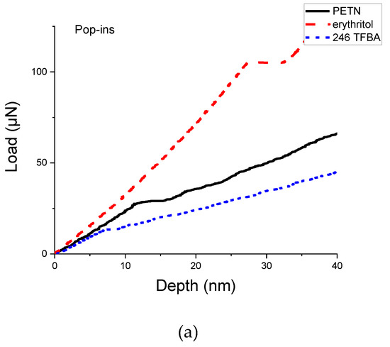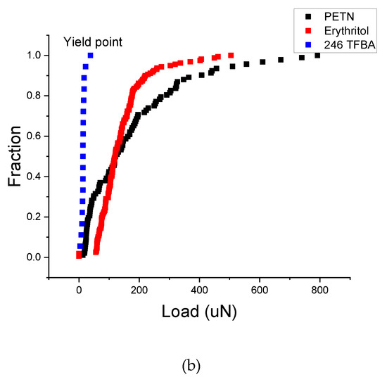 Incipient plasticity and fracture behavior of erythritol and 246 TFBA were studied in comparison to PETN because PETN powder is subjected to high mechanical loads when pressed into pellets for detonators. During compaction of PETN, the mechanical properties being probed include elastic, plastic, and fracture responses. Nanoindentation can provide detailed information on each of these regimes of mechanical response. Elastic behavior was reported in the previous section, as was hardness (resistance to plastic deformation). Material hardness is effectively dominated by the resistance to the motion of dislocations (i.e., plastic flow). Study of the initiation of dislocations can be particularly impactful when deforming either reasonably defect-free samples or materials with limited slip systems [16,35], both of which describe the molecular single crystals tested here. The onset, or incipient, plasticity can be assessed by “pop-in” analysis. A pop-in is a sudden increase in displacement without a corresponding increase in applied load commonly observed in indentation systems that are operated primarily in load control, and the first pop-in observed during loading is often considered to be the onset of plastic deformation [36,37]. Figure 6 shows typical pop-ins for these materials and uses a cumulative distribution of load at the first yield point (pop-in) to compare differences in defect density or defect formation. The ease with which 246 TFBA accommodates plastic deformation relative to PETN and erythritol indicates that either the initial defect density was very high in 246 TFBA, or that defects form easily in that material. However, given that all materials tested yield at loads below 1 mN, and loads expected in regular processing such as pressing are generally at least a thousand times higher than this [38], these differences are not expected to be impactful. In other words, relative to the high load conditions of a die press, the materials are effectively equally prone to plastic deformation.