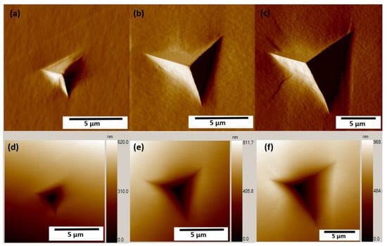 Scanning probe images (gradient) of Berkovich indents in PETN at loads of (a) 2 mN with no evidence of fracture, (b) 4 mN with no evidence of fracture, (c) 12 mN with possible fracture visible, and (d–f) scanning probe images (topographical) of the same indents as (a–c).