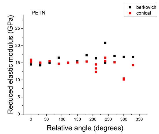Elastic modulus of PETN and erythritol as a function of relative angle, showing no evidence of in-plane orientation dependence. Orientation is arbitrary between samples, so 0° is not the same orientation between PETN and erythritol.