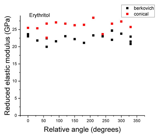 Mechanical anisotropy between crystal faces of molecular crystals is well-documented [16,39,40] and possible preferred directions for fracture have been observed [24], indicating that there may be in-plane directional anisotropy that is sensitive to the relative normal orientation of pyramidal indenter probes with respect to the crystal face. For example, some researchers have found that cracks tend to nucleate from the corners of pyramidal indents due to stress localization [41]. To test for this on various crystals of both PETN and erythritol, a single face of the crystal was chosen to be indented, and an arbitrary direction of that face chosen as the origin, labeled 0°. Two probes were chosen to study any in-plane anisotropy. First, a typical pyramidal (Berkovich) tip was used, which has a 120° angle between the edges. Second, an axisymmetric conical tip was used, with a circular cross section. The axisymmetric tip should show no in-plane orientation effects; if any were observed, the variation should only be due to random variability in the local properties. During the experiment, each crystal was rotated about a consistent normal direction relative to the arbitrary origin, and indented at 30° intervals with both Berkovich and conical probes. The goal was to determine typical variability of elastic modulus and hardness as a function of indenter probe angle. This procedure is similar to that employed by Taw et al [13] for aspirin and Maughan et al [21] for griseofulvin, though those studies sampled only the one crystal morphology each, with only a single pyramidal probe. The results of the present orientation study, exemplified in Figure 9, were that the in-plane orientation of the indenter relative to the crystal surface did not seem to affect the measured properties. Some random indents had abnormally low or high modulus results due, most likely, to local material properties (e.g., defects), but there were no systematic trends, particularly trends that would repeat at orientations that would align with equivalent directions (i.e., (111) and (11). This finding provides confidence in all nanoindentation-derived mechanical properties measured to date in these highly anisotropic molecular crystal materials.