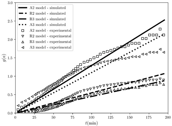 Figure 1, Figure 2, Figure 3 and Figure 4 concern the implementation of COMF onto data for the desolvation of tetrahydrofuran solvates of sulfameter [4] and Figure 5, Figure 6, Figure 7 and Figure 8 for the desolvation of methanol solvates of ciclesonide [3] at a single temperature. Due to the large amount of information, in Figure 1, Figure 2 and Figure 3 and Figure 5, Figure 6 and Figure 7 regarding the three different fittings, we show results associated with the four “best” models as ranked by COMF in a descending order. The results regarding the rest of the temperatures are shown in Tables S1–S7 and Figures S1–S4 for the methanol solvates of ciclesonide and Tables S8–S14 and Figures S5–S8 for the tetrahydrofuran solvates of sulfameter in the Supplementary Materials. In Figure 1, we present the fitting of the integral reaction rates for the four best models. Qualitatively, it is apparent, that for this single-step ISSR there is no model, which would give a perfectly linear integral reaction rate. Moreover, all of them are seemingly identical, with A2–A3 and R2–R3 having comparable time profiles of the integral reaction rate, respectively. Quantitatively, looking only at the coefficients (first column in Table 2), we observe that the first three highest ranked models, namely A2, R2, R3 are equally well fitted with coefficients very close to each other, while only A3 can be more easily discriminated based on its small . If CMF was employed and we relied only on the ranking based on the highest , we would obtain a set of four different BCMs (see Table 2). Particularly, following the CMF method, the BCM is the contracting volume (R3) with . Then, in descending order, come the 2nd order Avarami-Erofe’ev model (A2) with , the contracting area model (R2) with and in the fourth position the 1st-order reaction model (F1) with . It is interesting that the models R3 & A2, although based on different principles, exhibit almost identical determination coefficients, which differ just in the third digit. Consequently, CMF’s model choice criterion does not suffice to determine the BCM and a subjective selection becomes unavoidable. The selection would come after looking at the simulated conversion fraction, which makes the algorithm non-automatic and not user-friendly. Additionally, determining the BCM based on CMF will also result in a corresponding Arrhenius constant, , which does not necessarily ensure that using it to calculate the models’ conversion fraction, , would match the experimental conversion fraction. Here lies the main improvement of our approach, COMF, which adds more comprehensive criteria associated with the overall behavior of the various models and makes the selection of BCM more straightforward and reliable.