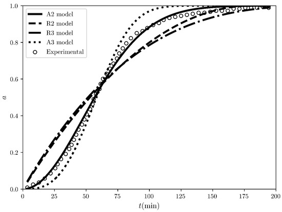 The fitting of the experimental conversion fraction itself with the analytical expressions of the various models tested (see Table 1) is shown in Figure 2. Qualitatively, this time, the 2nd order Avarami-Erofe’ev model (A2) model seems to perfectly overlap the experimental conversion fraction in comparison with the rest. This is also guaranteed quantitatively, where based only on the coefficients, A2 is ranked as the BCM with , while the rest have (see Table 2). These results so far prove to us that ranking the various models based on how linear the integral reaction rates exhibited are, meaning relying only on , is not the optimal way to determine the BCM. On the other hand, the ranking based on the coefficients is a more effective tool since the fitting is direct on the experimental conversion fraction. However, considering that in general, high determination coefficients and “best fit” are not in one-to-one correspondence, in COMF, we tried to incorporate all the possible fits in the context of model-fitting. The third type of fitting we performed is that of the reaction speed, shown in Figure 3. For this, the experimental conversion fraction was first fitted with a polynomial (see Figure S5 in the Supplementary Materials) and then this polynomial was used instead of the experimentally recorded conversion fraction to analytically calculate its derivative. Qualitatively, the models can be classified based on the shape of the modelled reaction speed curve. In Figure 3, the experimental reaction speed curve (black solid line) has a bell-like shape, which is approximated only by the 2nd and 3rd order Avarami-Erofe’ev models. Essentially, the fitting of the reaction speed has a very strong impact on ranking the various models, since only five out of the sixteen tested models exhibit positive coefficients (see the 3rd column in Table 2). Additionally, the highest ranked model based on is the 2nd order Avarami-Erofe’ev (A2) with , while second comes the contracting area (R2) model with . Apparently, the difference in between them is very large. Thus, the significance of incorporating the reaction speed’s fit into COMF is not only that it enhances the evaluation of the BCM, but it also sieves all the tested models and abruptly discards the models which do not have similar physical behavior in the reaction rate.