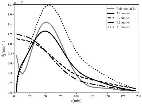 In the third step, the so-called reaction speed, which is the time derivative of the conversion fraction , is calculated from the experimental data (second process of STEP 3 in Scheme 1) and it is fitted using the expressions with obtained from the second step of the algorithm (third process of STEP 3 in Scheme 1). Therefore, given these constants we calculate the determination coefficients () for each fit. At this step, there is only one procedure which often might be cumbersome to implement, and this is the time derivation of the experimental conversion fraction (i.e., reaction speed). Mostly, the fitting of the reaction speed is hindered due to the nonsufficient smoothness of the derivative. In fact, its smoothness depends on the interval, at which the experimental conversion fraction was recorded. The smaller the recording interval, the smoother the derivative. Hence, if it is not small enough, the experimental conversion fraction must be first fitted with a polynomial, see Equation S1 in the Supplementary Materials, of a degree such that allows a smooth derivation (first process of STEP 3 in Scheme 1). Then, unlike the fittings implemented in the first and second step, the polynomial expression of the conversion fraction is used instead the corresponding experimental one.