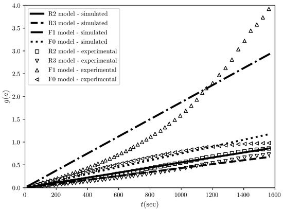 where is the frequency factor, is the activation energy, is the absolute temperature and is the ideal gas constant. The differential reaction rate, , is a function of the conversion fraction and its form depends on the principal solid-state reaction mechanism, such as nucleation, diffusion, geometrical contraction, etc. [14,17,18,21,27]. By integrating Equation (2) over time, the so-called integral form of the reaction rate, , is obtained: