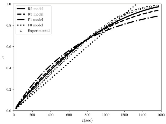 A variety of different models has been developed considering different reaction mechanisms [18]. Table 1 includes the most commonly used models found in the literature. The first column (left-hand side) of Table 1 includes the models’ names. All models used here are classified into four families, namely: nucleation, geometrical contraction, diffusion and reaction-order models. In the first column, we can therefore find each family (written in italic) and exactly below it the corresponding models. The models’ names, shown in Table 1, are represented by a letter attached to an integer number (e.g., A2). The letter reflects the model’s type, while the integer number is related with the reaction mechanism considered in each case. Specifically, the symbols P, A, R, D, F stand for Power Law, Avarami-Erofe’ev, Contraction, Diffusion and Reaction-Order, respectively. Details concerning all the different models used here, reaction mechanisms, and derivation of each model shown in Table 1 can be found in the literature [10,27,28,29]. Moreover, the second and third column of Table 1 include the forms of the so-called differential and integral reaction rates respectively for the various models. In fact, commonly in the literature, only the differential and integral rates for the various models are tabulated. However, in this work, we analytically solved the integral rate equation, , to obtain an expression for the conversion fraction itself for each model considering an arbitrary Arrhenius rate constant (). These expressions are listed in the last column (right-hand side) of Table 1 accompanying their corresponding rates. Having the conversion fraction in a functional form is essential for our methodology as it is described below. Apparently, there are no analytical expressions of the conversion fraction for the diffusion models D2 and D4, for which the solution of the conversion fraction was obtained by numerical integration [30].