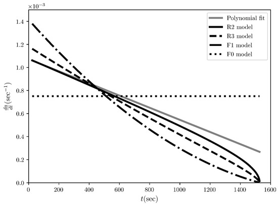 The reaction speed time evolution regarding the desolvation of the methanol solvates of ciclesonide at 115 °C. The solid grey line represents the rate evaluated from the initial polynomial that fits the experimental conversion fraction measured by L. Zhou et al. [3] while the solid and dashed black lines represent the fitting curves for the “best” four models ranked by COMF, i.e., R2, R3, F1 and F0 models.