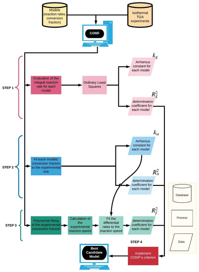 Here, we attempt the development of a more comprehensive approach that minimizes any ad hoc selection of the BCM. The so-called comprehensive model-fitting method (COMF) is thus presented and its applicability is illustrated on two experimental kinetic data sets. Please note that we applied the method only in cases associated with single-step ISSRs. The workflow we developed and implemented is depicted step-by-step in the next scheme.