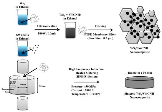Figure 1 shows a schematic illustration of the preparation process of the WS2/SWCNH nanocomposite through a HFIHS. WS2 (Alfa Aesar, 99.8% metal basis) and SWCNH (Sigma Aldrich, St. Louis, MO, USA) powders with a given ratio were dispersed in ethanol under sonication at 560 W for 10 min, and then mixed together. The mixed dispersion of WS2 and SWCNH powders was vacuum-filtrated using a polytetrafluoroethylene (PTFE) membrane filter with a pore size of 0.2 μm (Millipore, San Francisco, CA, USA), and the sediments on the filter were dried under vacuum (~10−2 torr) for 24 h at 300 K. The dried powders of the WS2/SWCNH mixture were introduced into a graphite die with a diameter of 30 mm and compressed under a pressure of 10 MPa for 30 min, followed by sintering under a pressure of 50 MPa at 1450 °C and pulsed-current 2800 A for 5 min using the HFIHS system (Vacuum Science Laboratory) (Figure S1, see Supplementary Materials). For comparison, a pristine WS2 composite was fabricated using the same methodology. As-sintered composites were cut and polished into the desired shapes for measuring thermal conductivity (Φ12.7 × 2 mm3), electrical conductivity, and Seebeck coefficient (2 × 3 × 10 mm3) as well as carrier concentration and mobility (10 × 10 × 1 mm3). The composite specimens were denoted as WS2, WS2/SWCNH(0.1), WS2/SWCNH(0.5), and WS2/SWCNH(1.0) corresponding to 0, 0.1, 0.5, and 1.0 wt.% content of SWCNH, respectively.