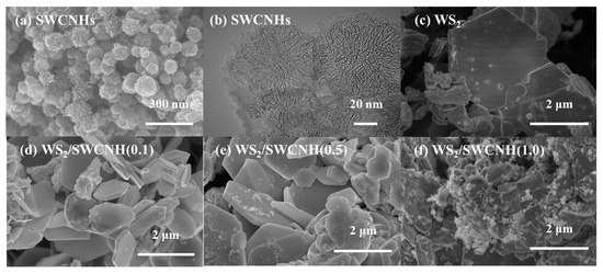 (a) Field emission scanning electron microscopy (FE-SEM) and (b) high-resolution transmission electron microscopy (HR-TEM) images of SWCNHs; FE-SEM image of (c) WS2, (d) WS2/SWCNH(0.1), (e) WS2/SWCNH(0.5), and (f) WS2/SWCNH(1.0).