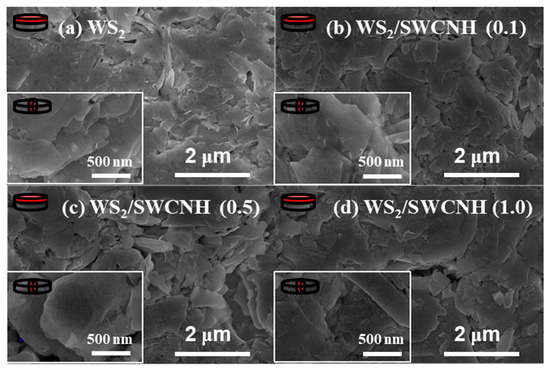 FE-SEM images of as-sintered (a) WS2, (b) WS2/SWCNH(0.1), (c) WS2/SWCNH(0.5), and (d) WS2/SWCNH(1.0).