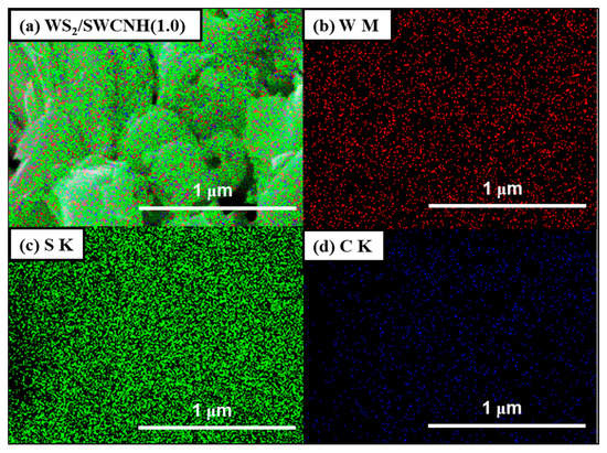 FE-SEM-EDX mapping of the sintered WS2/SWCNH(1.0) nanocomposite: (a) WS2/SWCNH(1.0), (b) W M, (c) S K, and (d) C K.