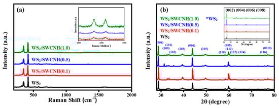 (a) Raman spectra and (b) x-ray diffraction (XRD) patterns of the as-sintered WS2 and WS2/SWCNH nanocomposites. Insets show the respective magnified graphs.