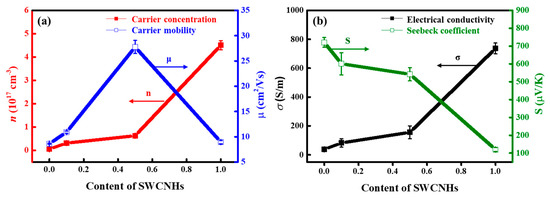 (a) Carrier concentration and carrier mobility plots. (b) Electrical conductivity and Seebeck coefficient of the WS2/SWCNH nanocomposites with the content of SWCNHs.