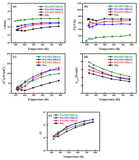 The temperature dependent thermoelectric properties of the sintered WS2 and WS2/SWCNH nanocomposites were further investigated between 300 and 780 K, as shown in Figure 7. The electrical conductivity values of the whole samples increased with temperature, indicating conventional semiconductor like behavior, as shown in Figure 7a [25]. The pristine WS2 exhibited an electrical conductivity of 125.51 S/m at 780 K. By adding SWCNHs, the electrical conductivity of the nanocomposites is increased to 1181.37 S/m for WS2/SWCNH(1.0), which was similar to the behavior at room temperature.