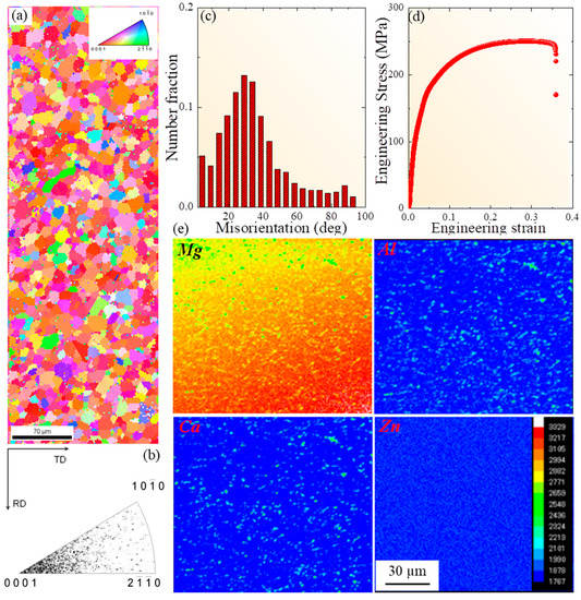 (a), (b) and (c) Inverse pole figure map, texture inverse pole figure, and misorientation angle distribution of the AZ31-Ca Mg alloy, respectively. (d) Room temperature tensile curve of the alloy. (e) Electron probe microanalysis maps of the alloy.