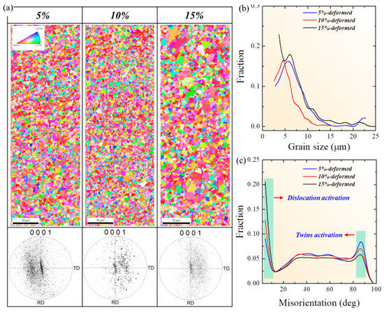 (a) Inverse pole figure maps and related 0001 pole figures of the AZ31-Ca Mg alloy samples stretched to 5%, 10% and 15%. (b) and (c) grain size and misorientation profile of the stretched alloy samples, respectively.