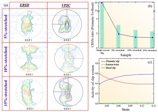 (a) Pole figures of the stretched samples obtained by the EBSD measurements and by VPSC modeling. (b) CRSSs ratio (prismatic/basal) of single crystal Mg and the stretched samples. (c) The activity of basal slip, prismatic slip and tension twins of the AZ31-Ca alloy investigated in the present work.