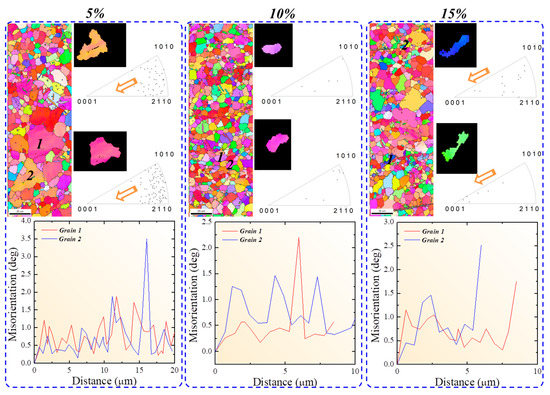 In-crystal misorientation axis (ICMA) measurement carried out by EBSD is a useful tool to determine the type of slip system which might operate during deformation of metallic materials [18,19]. Generally, dislocations generated during the early stage of plastic deformation bend the crystal, leading to the so-called in-crystal misorientation, and through the characteristics of this misorientation axis, the type of dislocation can be determined. For example, basal dislocations induce the crystal bending around , whereas an axis parallel to is obtained in the case of prismatic dislocation-plasticized crystals [20,21]. The ICMA measurements carried out on the stretched alloys samples are shown in Figure 4. The ICMA was conducted on three randomly selected grains from each sample. Figure 4 shows that the number of misorientation axes that come to be parallel with increased upon increasing the magnitude of stretching, suggesting that the crystal plasticity of this alloy is mainly aided by the prismatic dislocations rather than the activation of tension twins. This is consistent with the misorientation angle distributions and VPSC calculations presented in Figure 2c and Figure 3, respectively. The higher activity of prismatic slip systems is mainly related to the Ca addition, which led to the formation of (Mg,Al)2Ca particles, as shown by the EPMA maps in Figure 1e. During the primary processing of the Ca-added Mg alloy, these particles can weaken the basal texture through inducing the recrystallization [22,23]. Accordingly, one way to explain the high activity of the prismatic slip is the particle-induced basal texture weakening, where in such a texture, a higher amount of stress can be resolved in the prismatic plane when comparing with strong basal-textured Mg, leading to the high activity of the prismatic slip. Another approach to figure out such high activity of prismatic slip is related to the strengthening effect of these particles in the basal plane which, in turn, lead to reducing the ratio between the CRSS of prismatic and CRSS of basal (Table 1). The intrinsically hard-to-operate prismatic slip becomes preferred relative to the extrinsically hardened basal slip, leading to the enhanced plasticity of the alloy investigated in the present work. Further transmission electron microscopy-based observations are required to investigate the nature and characteristics of the interaction between basal dislocations and particles in the AZ31- 0.5Ca Mg alloy.