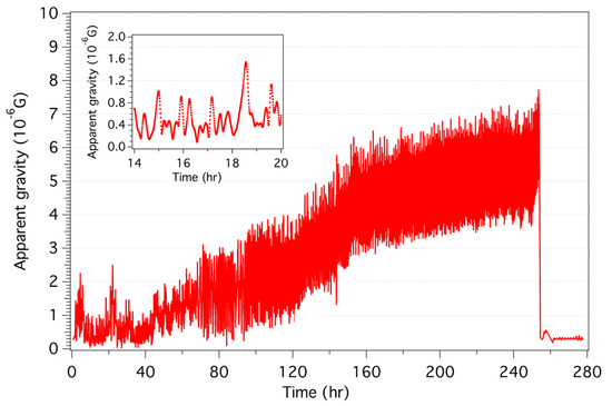 Modulus of the apparent gravity (residual acceleration) as a function of the time (0 is the beginning of the mission). The insert corresponds to the first six hour interval showing the amplitude and duration of the standard oscillation of the gravity level.
