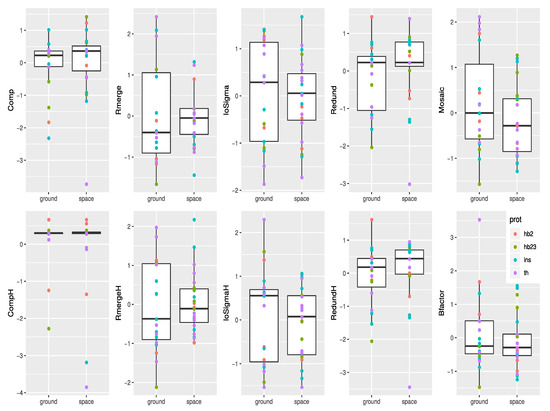 Minimum, lower-hinge, median, upper-hinge, and maximum for each of the ten analyzed indicators is shown as box plots of the values obtained from the two (space/ground) populations. The individual values are over-plotted as circles colored according to the protein.