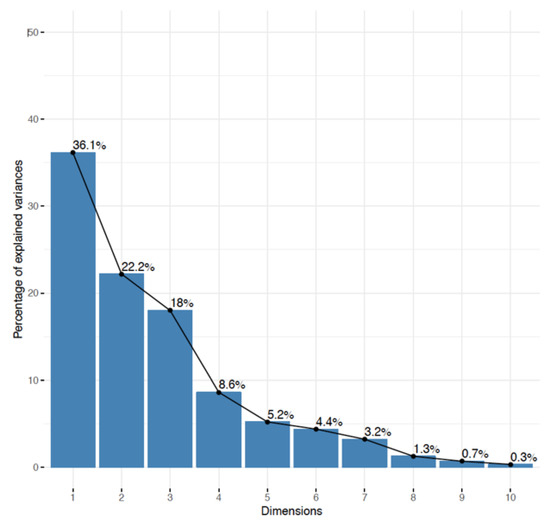 Percentage of variance explained by each of the ten dimensions obtained by PCA analysis of the distributions of quality indicator values.